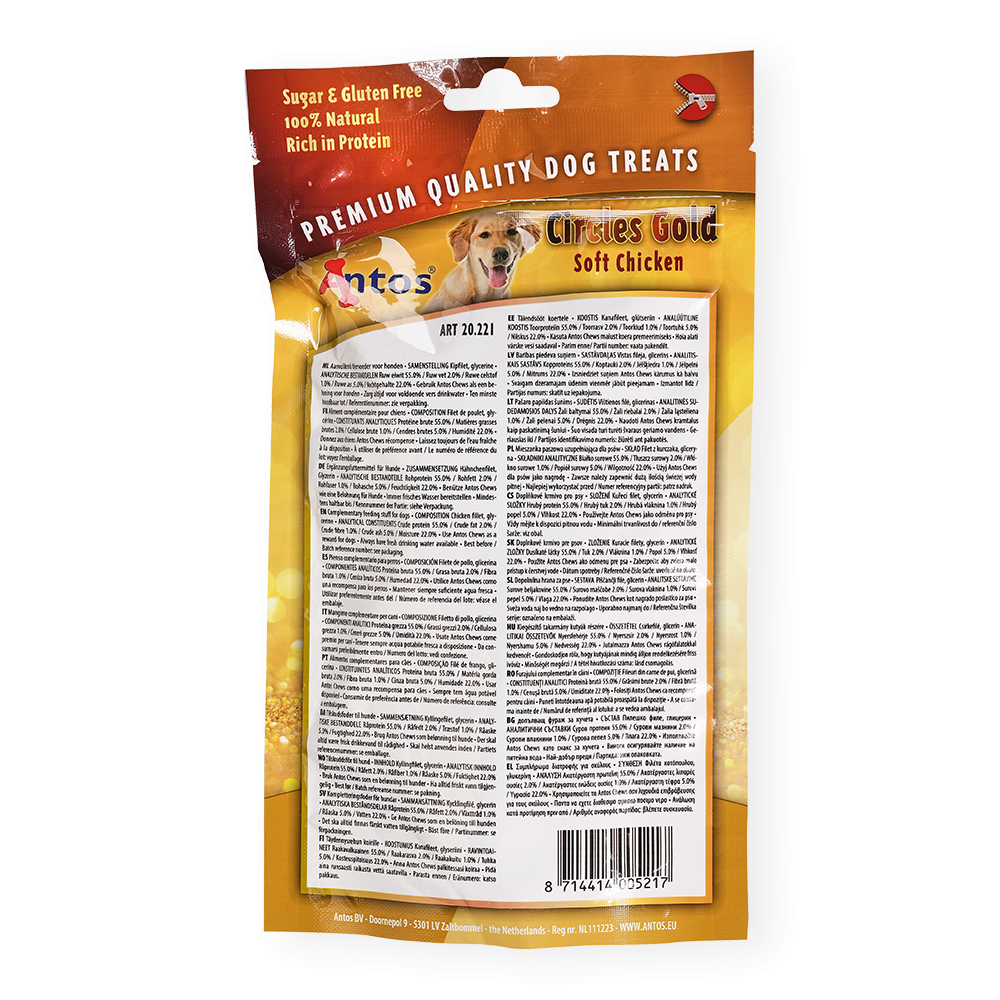 Our Antos Circles Gold are made from chicken formed in a mouth-watering ring shape to keep snack time fun and playful for your best friend. These grain-free treats are carefully roasted to ensure optimal flavour.