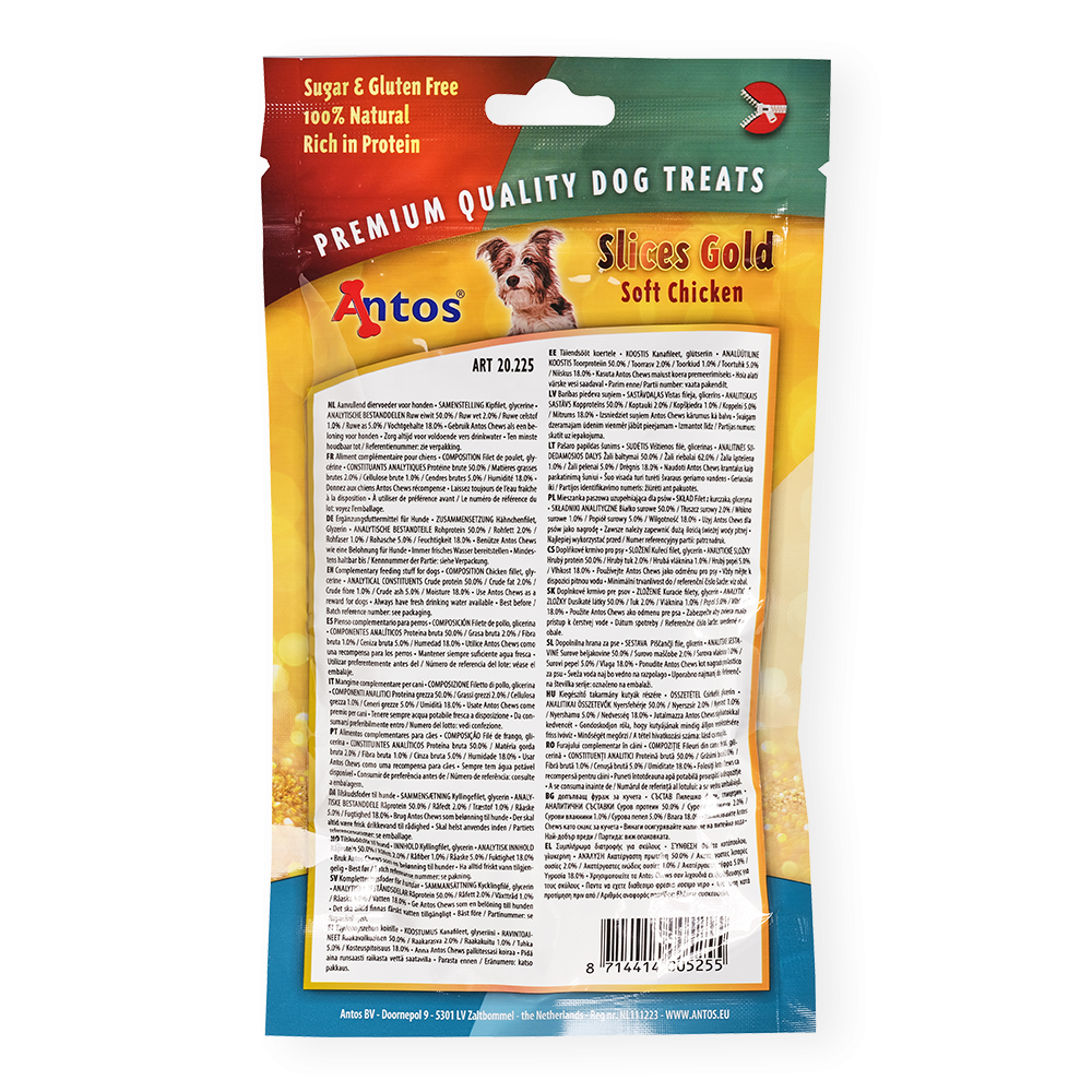Reward your lovely dog with Antos Slices Gold. These treats are made with real chicken for the savoury, smacking flavour dogs crave. The completely grain-, gluten- and sugar-free treats are the perfect treats for your furry friend.