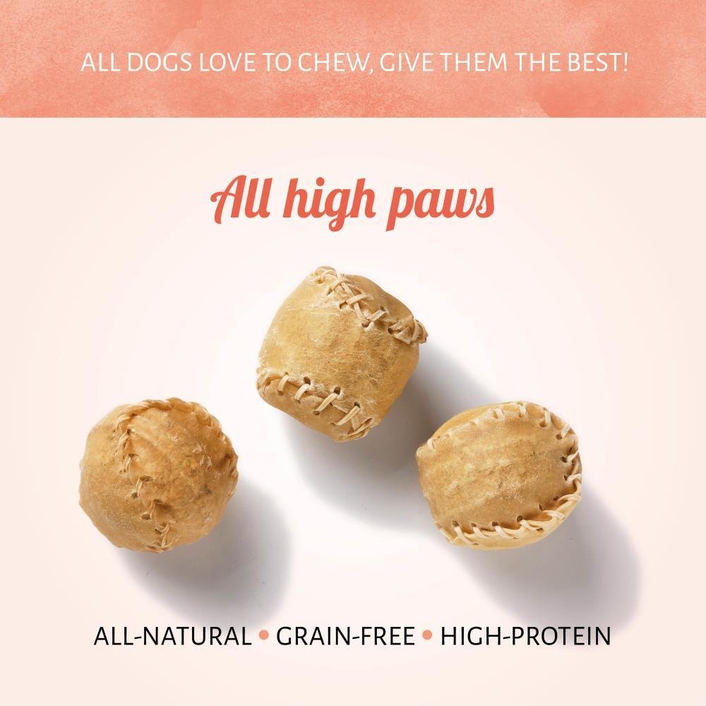 Add enjoyment to your dog's snack routine with Baseball dog chews. The all-natural rawhide chews are perfect for a backyard chewgame with your favourite friend. It's going, going and chew!