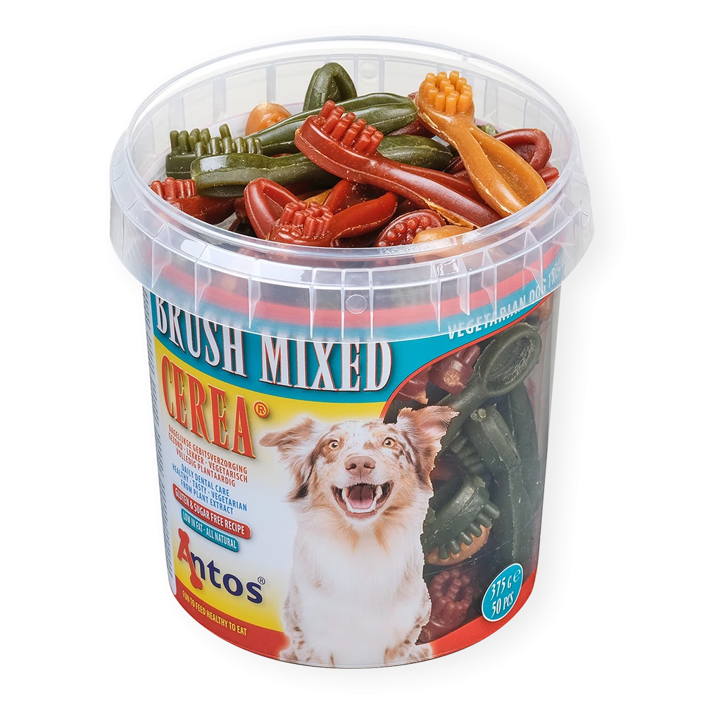 Shaped like a brush, tastes like a treat. Spoil your favourite furry friend with all-natural doggie dental chew. The vegetable-based texture will help remove plaque and tartar as your dog chew. Vegetarian, gluten free. Made with all-natural ingredients.