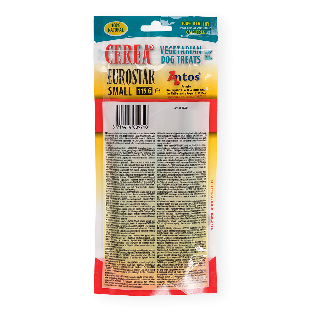 Meet the tooth-scrubbing texture of Cerea Eurostar. The unique texture and shape of these dental chews helps scrub away plaque and tartar with every bite. The treats will please your dog’s spirit and his tummy too!