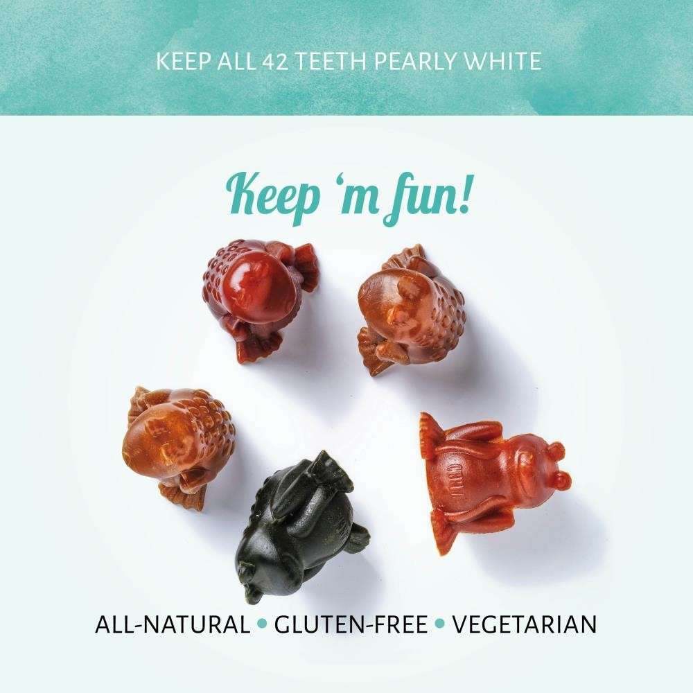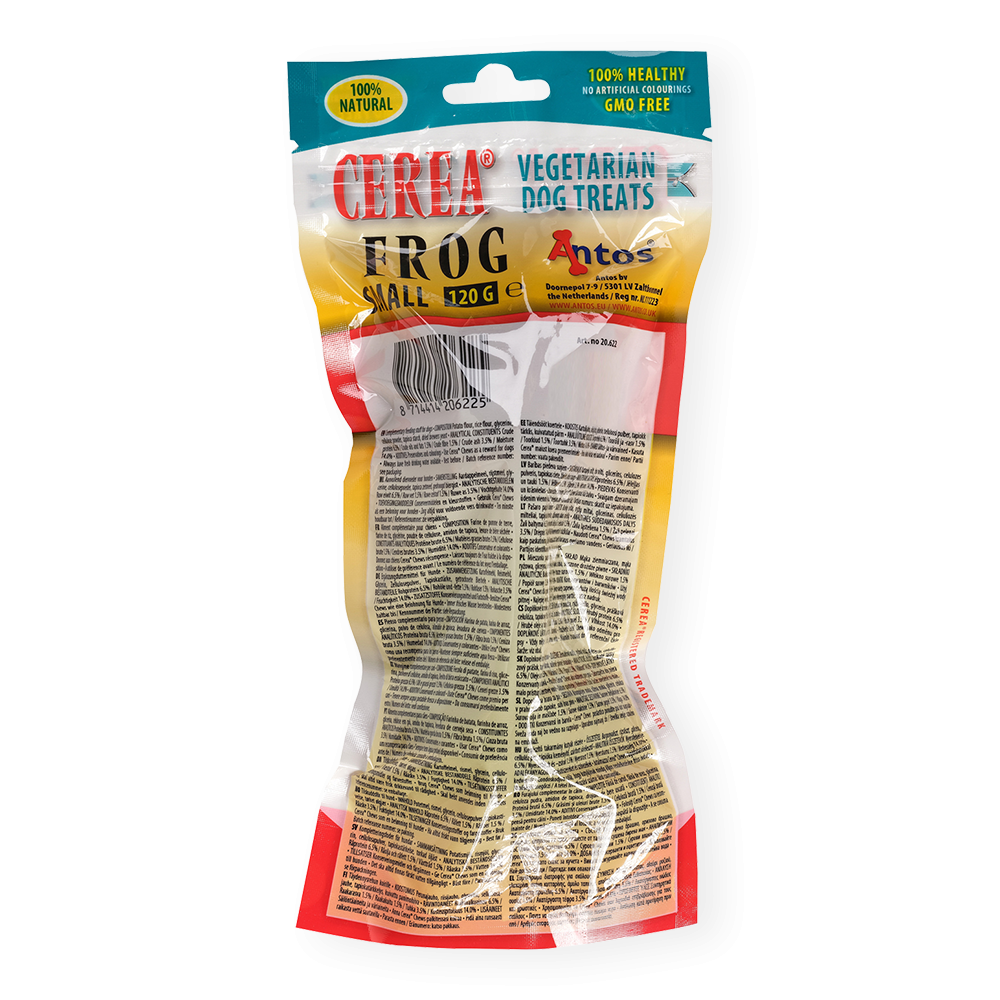 Our fun Cerea Frog shape helps remove tartar and plaque as your dog chews. The dental chews are low in fat, gluten-free, vegetarian and all natural. Your dog is sure to love the delicious ingredients.
