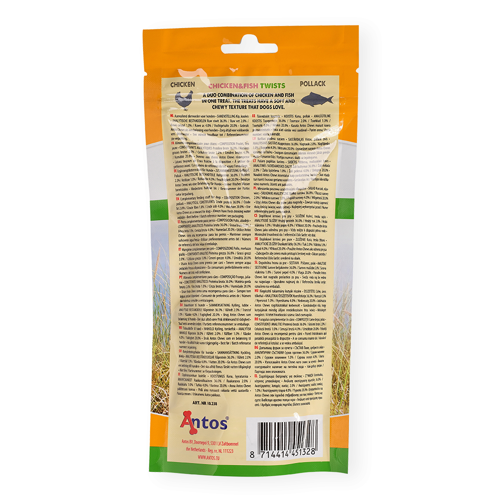 Chicken&Fish Twists is packed with tasty chicken twisted together with healthy fish. The treats are perfect for use as a snack or as a training aid, and will help reduce plaque and keep your dog's gums healthy.