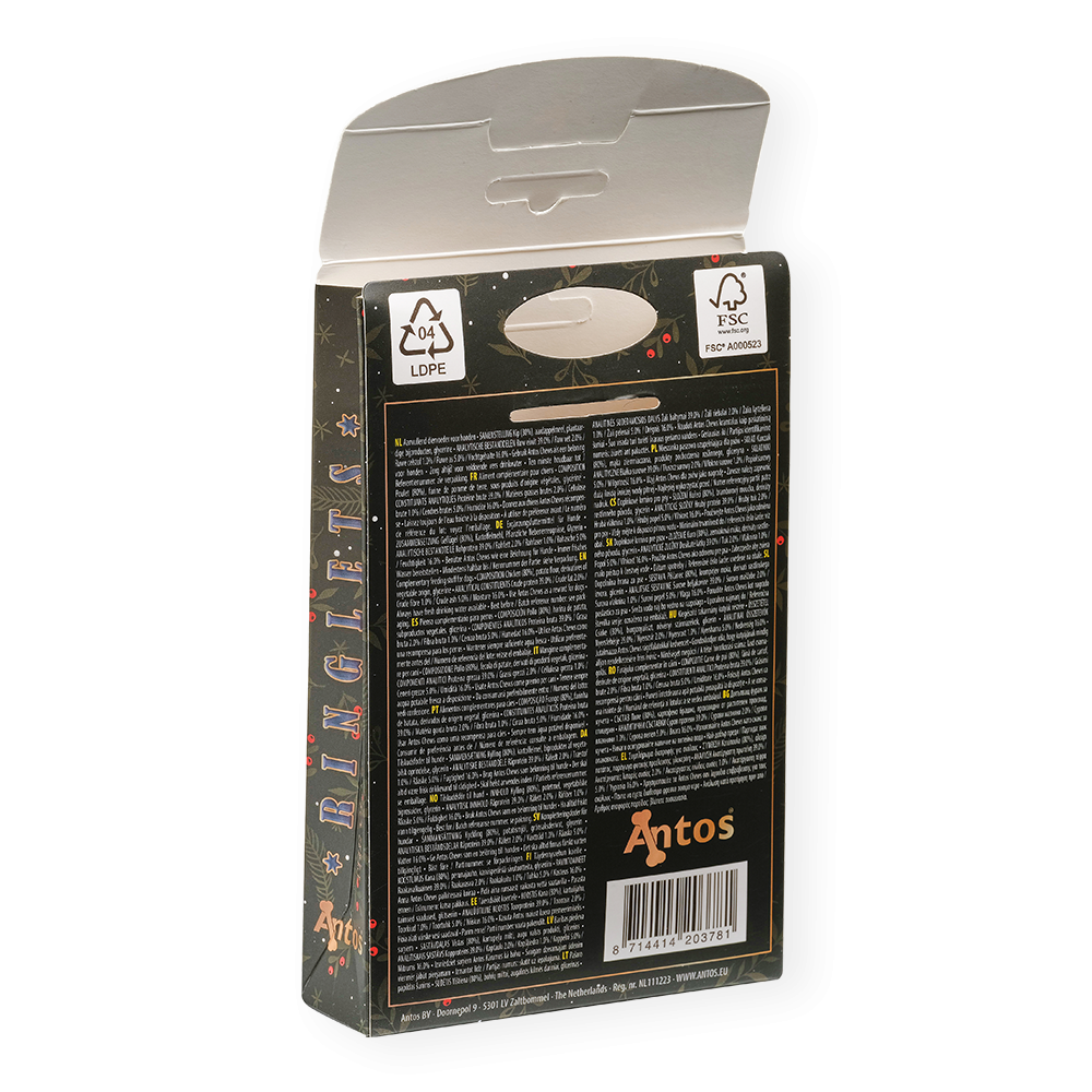 Bring the classic winter vibe to your dog's snack routine. These Christmas Ringlets are exclusively handmade and the perfect combination of chicken and cheese. Give them straight out of the package or add a little sweetness to your dog's Christmas breakfast. A real holiday feel!