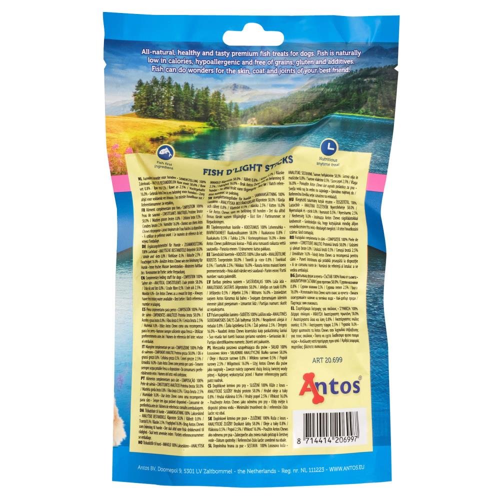 Give your furry friend a taste of salmon with our Fish D'light Sticks. The treats are made of 100% natural edible salmon skins and they also reduce tartar and plaque buildup for healthier gums and teeth.