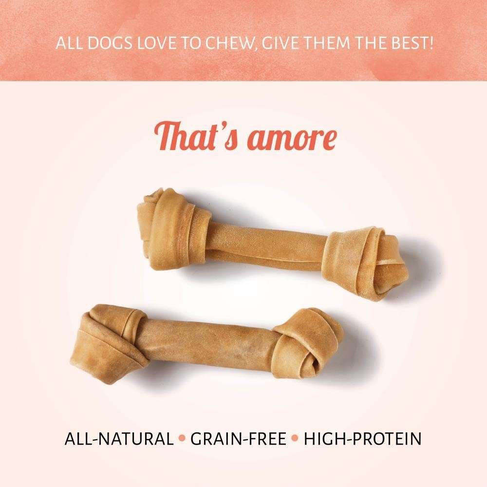 Knotted Bone dog chews in a pack of two. That's amore. These all-natural rawhide chews are drool-worthy good and made with the authentic quality your beloved dog deserves.