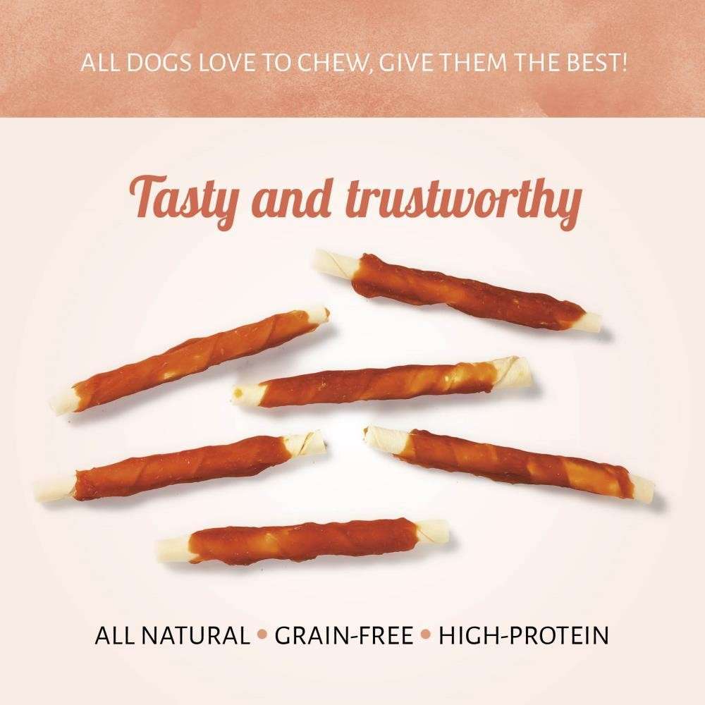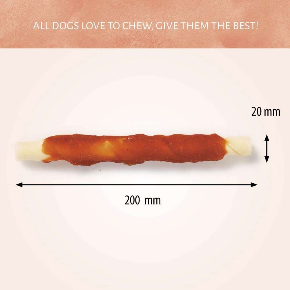 Our classic Raw Hide White + Chicken Roll dog chews are made with tender chicken breast meat wrapped around a rawhide stick for an interesting, high quality chew your dog won’t be able to resist. The dog chews are sure to be a hit in your home.