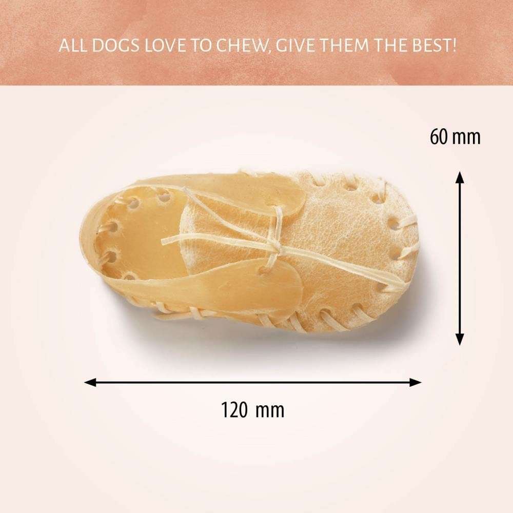 Your furry family member will love playing with our Shoe dog chews. Each little shoe is made of all-natural rawhide and has real laces your dog will love to chew on. You could also get extra creative to stuff them with meat