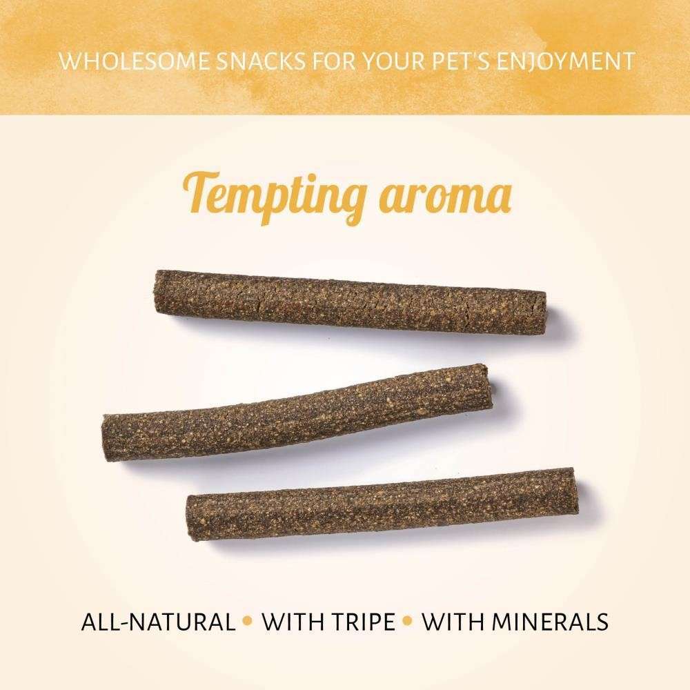 Show your dog the love with a snack that's cooked to perfection with Tripe Sticks. The soft-baked sticks pack the tempting aroma, chewy flavour of an oven-baked bite. Just home-style goodness in each stick.