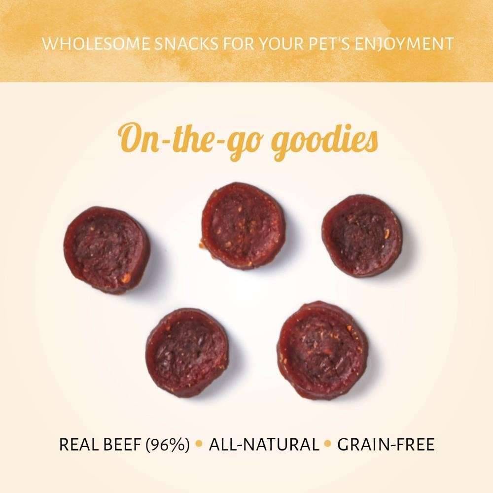 Help your dog thrive by giving him a wholesome snack similar to his ancestors enjoyed in the wild. These WILD Beef dog treats are made with real beef and contain no grains. Each tasty treat is made up of 96% beef.